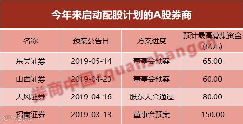 5月14日,东吴证券发布配股预案,募资总额不超过65亿元;4月23日,山西证券发布配股预案,募资资金总额不超过60亿元;4月15日,上市不足半年的天风证券发布配股预案,拟募集资金不超过80亿元,该预案已于本月初通过股东大会审议;3月12日,招商证券也公布配股方案,募集资金不超过150亿元。