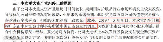 5月24日晚间,中路股份公告终止重组。在终止原因方面,中路股份表示:由于公司本次重大资产重组历时时间较长,期间国内护肤品行业市场环境发生较大改变,导致标的公司经营情况有所波动,业绩未达承诺预期;此外,2019年5月9日,本次重组审计机构广东正中珠江会计师事务所被中国证监会立案调查。