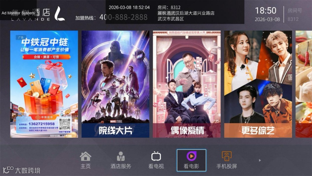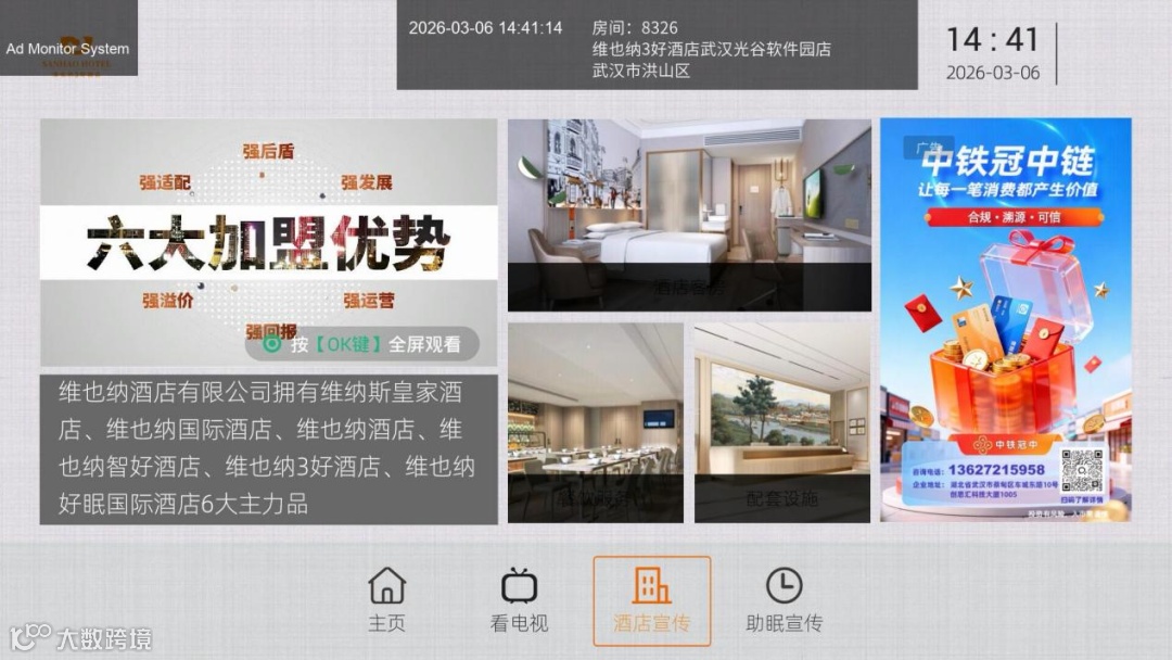 高档酒店场景深度覆盖:品牌广告登陆君澜/亚朵/锦江/维也纳/全季/丽呈/喆啡/丽枫/桔子/潮漫/宜必思/碧桂园/开元/温德姆/纽宾凯/和颐/华美达/凯里亚德/兰欧/康铂/喜来登等多家中高档酒店,在人流密集场景持续展示,进一步扩大品牌知名度;