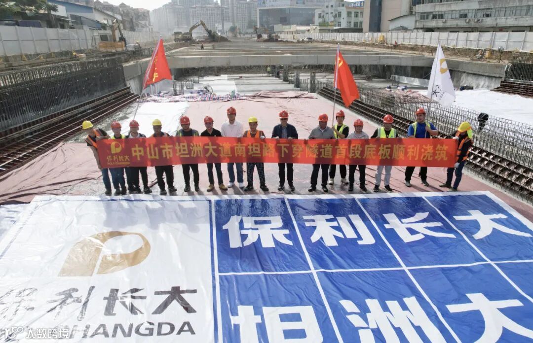 11月15日,中山市坦洲大道项目南坦路下穿隧道主体结构底板首件成功浇筑,吹响保利长大首个市政类下穿隧道工程建设冲锋号角。