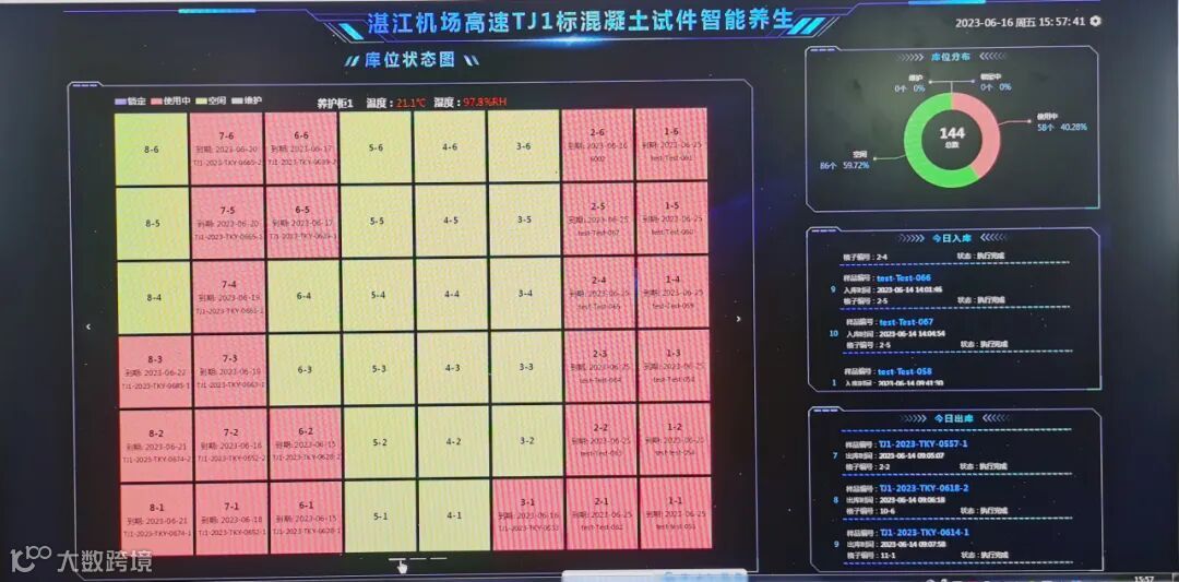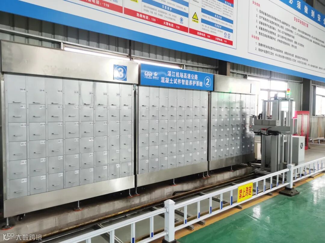 保利长大湛江机场高速TJ1标应用养护分拣一体化智能设备,可以根据场地大小、项目规模,因地制宜地灵活拼装并重复使用,配合全自动控制的搬运车和管理系统,实现试件养生全周期的管理、试件出库入库全自动,大量节省人工。