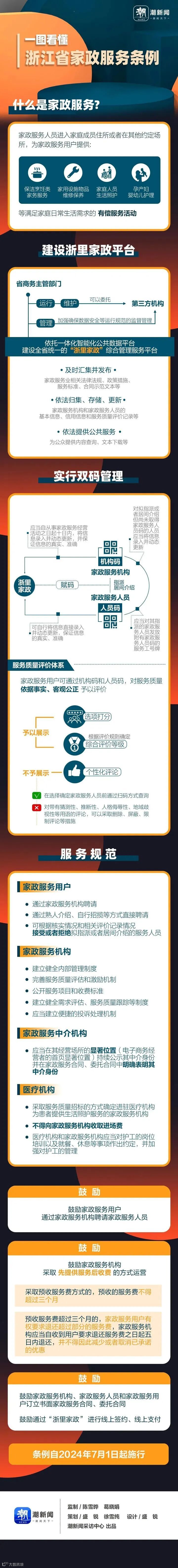 第二,家政服务将赋码管理,根据《条例》,浙江省商务主管部门将建设全省统一的“浙里家政”综合管理服务平台,对按照规定录入信息的家政服务机构、家政服务人员,通过公共数据平台统一的数据共享通道核查身份信息后,赋予家政服务机构码、家政服务人员码;对家政服务人员的健康证明、技能等级状况、从业经历等信息通过数据共享通道比对后,在家政服务人员码予以显示并动态更新。