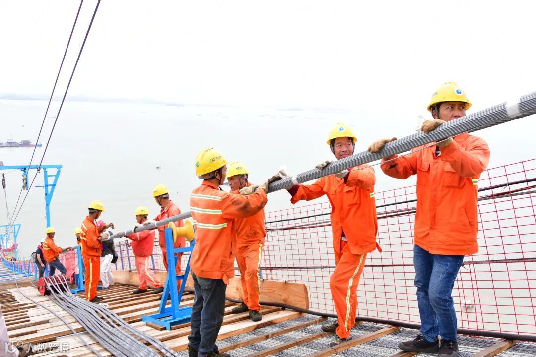 施工现场,穿着橘黄色工服的工人将索股的前端拉出,挂在系着大红花的拽拉器上,在卷扬机的拉动下,拽拉器慢慢地向大桥的另一岸移动。工人在猫道上“守护”着索股不断前进,确保索股平行地架在托滚上。从西锚走上米270高的主塔,经过1666米的主桥,再从主塔往下来到东锚,全程6小时,顺利完成索股架设。