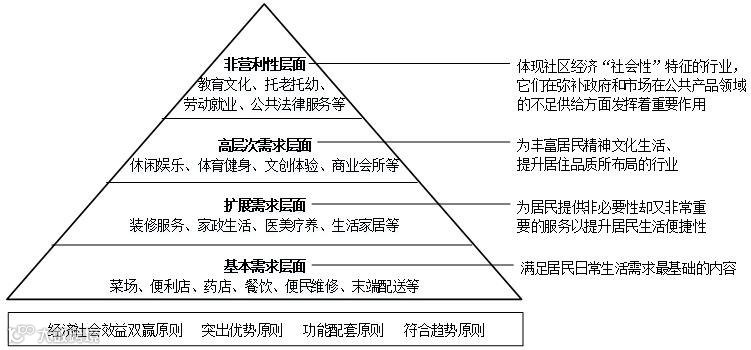 1.明确城市社区产业配置原则与层级构成。具体来说,社区产业的选择有以下四个原则。第一,经济社会效益双赢原则。考虑社区经济的特点,城市社区产业体系要兼顾经济性和社会性,形成双轮驱动的动力机制和利益共享机制。也就是说,既要布局商业和生活性服务业,满足社区居民生活与休闲需求;也要在社区教育、文化、养老、就业、环境等方面注重以人为本,推动非营利性行业发展壮大。第二,突出优势原则。应在深入调研、盘清社区资源底细的基础上,发挥社区资源要素或产业基础等优势,构建有鲜明特色的产业体系,从而发挥比较优势,降低经营成本,提升对消费者的吸引力,推动城市社区经济“个性”发展。第三,功能配套原则。要综合考虑所处城市的基本市情,对城市内部市、区、街道及社区进行纵向考量,兼顾区域性与整体性的功能配套。区域性功能配套方面,保证社区内应有经济业态配置齐全、基本功能涵盖完善,尤其注重与居民日常生活息息相关的民生性、微利性行业的发展;整体性功能配套方面,在城市尺度上明确各个社区的基本定位和所需承接功能,构建以社区为点,人流、物流、信息流为线,辐射范围为面的城市网络体系,服务于整个城市的功能运转。第四,符合趋势原则。要有效吸纳与利用国内外先进适用技术,突出技术的发展性,同时要满足居民随社会发展而不断变更的需要,融入产业发展新理念,布局经济发展新业态。