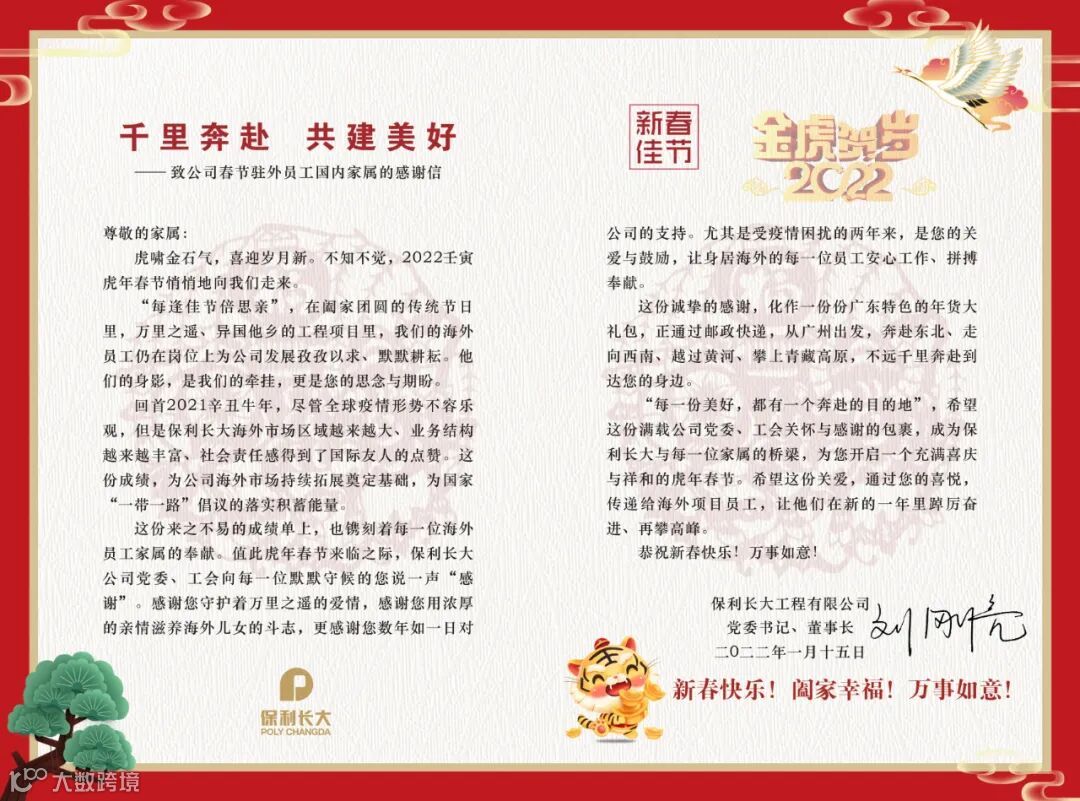这份来之不易的成绩单上,也镌刻着每一位海外员工家属的奉献。值此虎年春节来临之际,保利长大公司党委、工会向每一位默默守候的您说一声“感谢”。感谢您守护着万里之遥的爱情,感谢您用浓厚的亲情滋养海外儿女的斗志,更感谢您数年如一日对公司的支持。尤其是受疫情困扰的两年来,是您的关爱与鼓励,让身居海外的每一位员工安心工作、拼搏奉献。