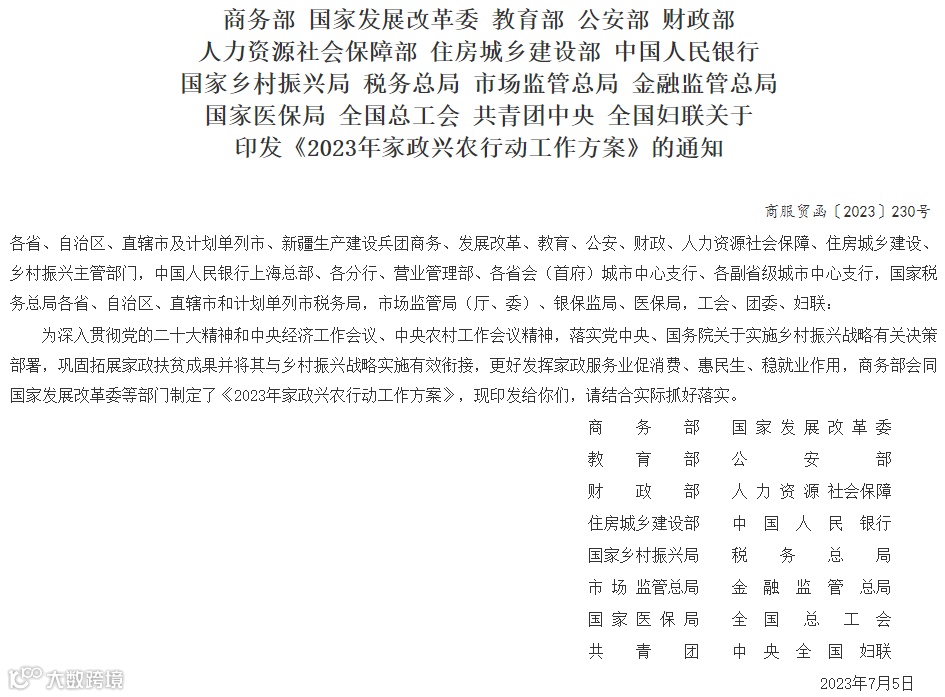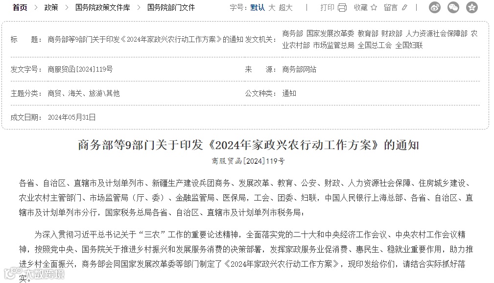 家政服务行业最近的热度真的很高啊,这不又有国家又有政策下来了,近日,商务部等9部门联合印发了《2024年家政兴农行动工作方案》,从促进供需对接、加强品牌培育、加大帮扶力度、完善支持政策、优化发展环境,五个方面提出25项具体措施,深入开展2024年家政兴农行动,提振家政服务消费,助力推进乡村全面振兴。