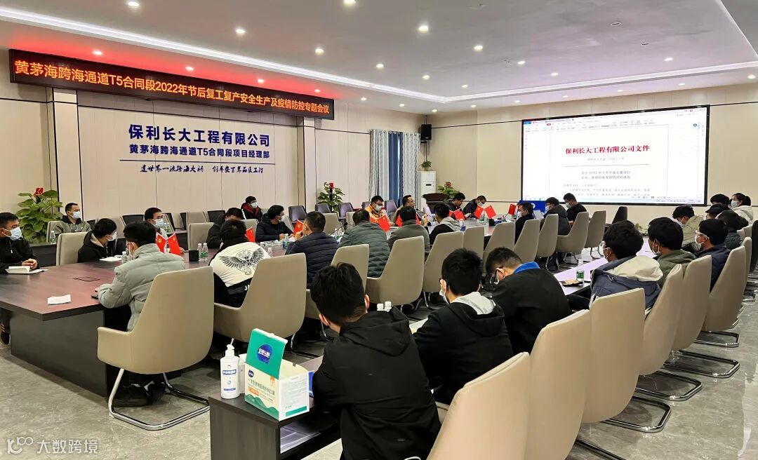 2月8日,黄茅海跨海通道T5合同段召开节后复工复产安全生产及疫情防控专题会议,要求各部门及所属劳务队伍严格落实政府疫情防控政策及项目部《疫情防控方案》,狠抓一季度生产任务落实,大干快上干实现新年开门红。