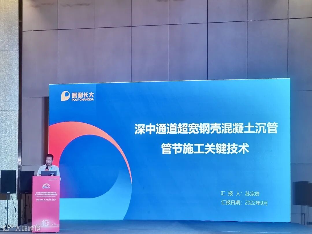 大会共设置2个主论坛,7个主题论坛,30多位国内外院士,80多位行业大师、专家学者通过线上+线下方式分享报告,保利长大应邀现场作《深中通道超宽钢壳混凝土沉管管节施工关键技术》主题报告。