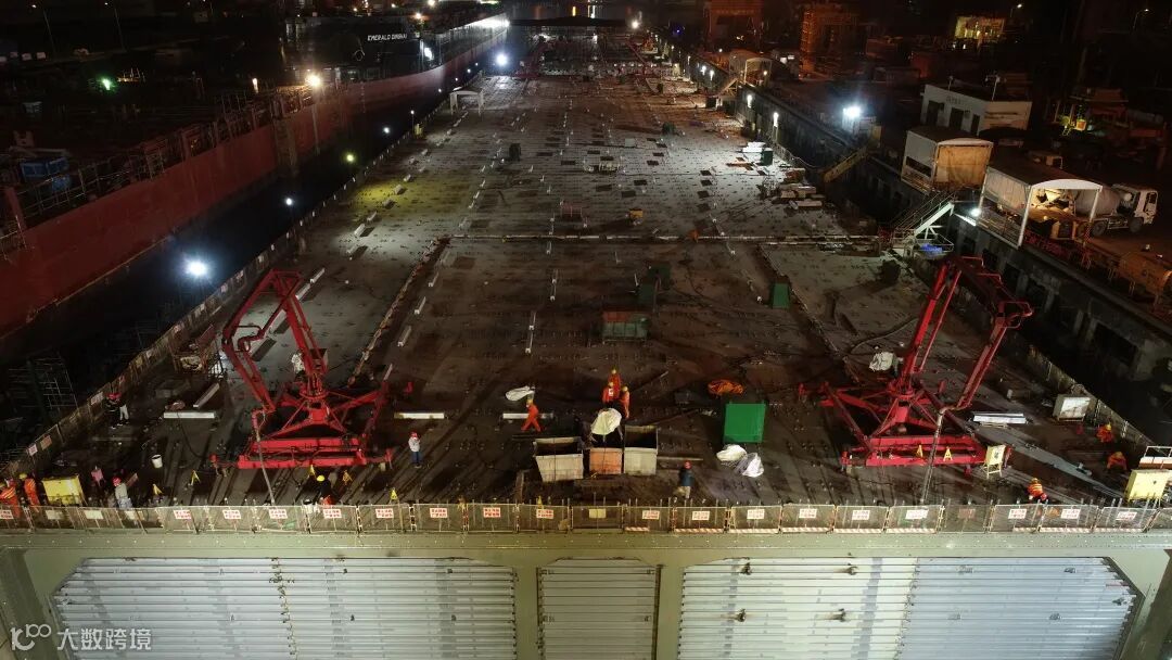 E25管节为标准管节,长165米、宽46米、高10.6米,由2255个独立隔仓组成,浇筑自密实混凝土方量约2.93万方,浇筑完成后管节总重约8万吨,相当于一艘重型航母的排水量。管节浇筑预制完成后,下一步将进行浮运沉放安装。