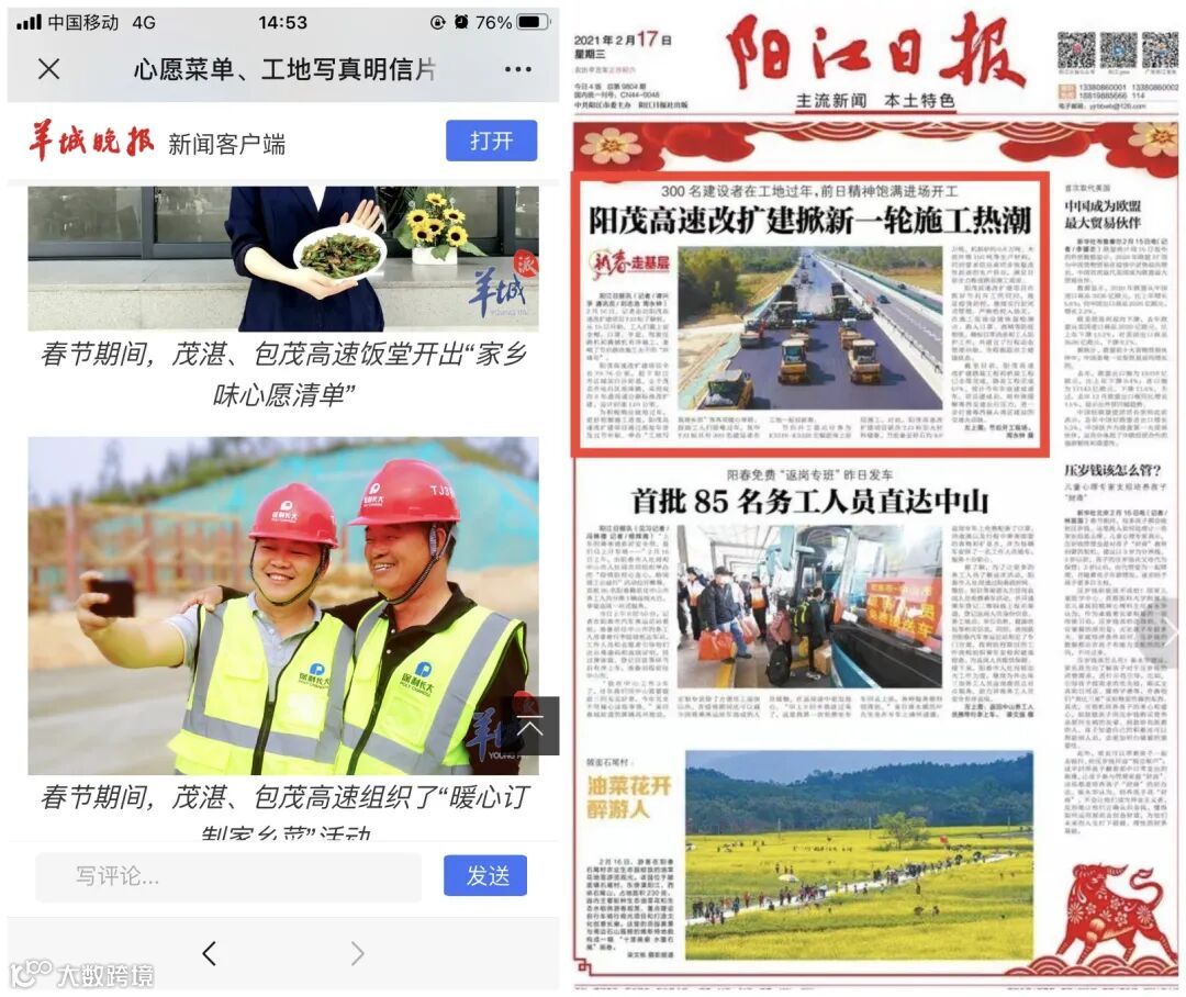 羊城晚报、广州日报、阳江日报等媒体报道阳茂改扩建项目留年举措及节后复工情况