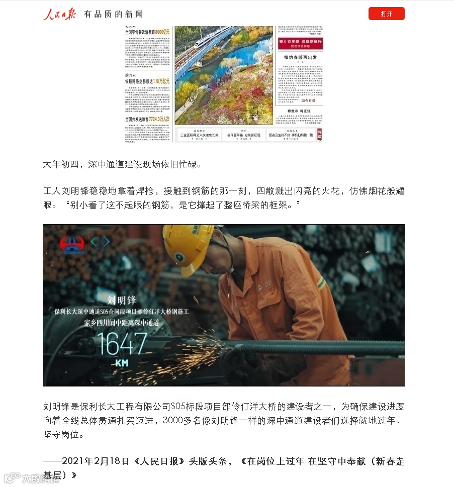 人民日报头版报道深中通道S05标留粤过年、坚守岗位的一线建设者刘明锋