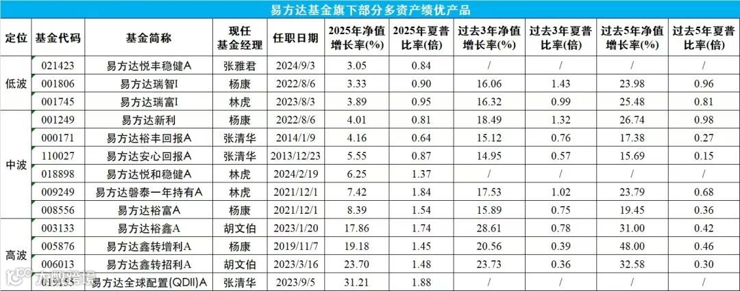 其中,低波产品会严格控制权益资产的暴露比例,对波动率也有严格限制;而中波、高波产品对权益资产的配置有更宽的区间,可利用股票、转债等获取长期显著高于债券的收益。无论是低波、中波还是高波类型,易方达基金均打造出中长期绩优代表产品。