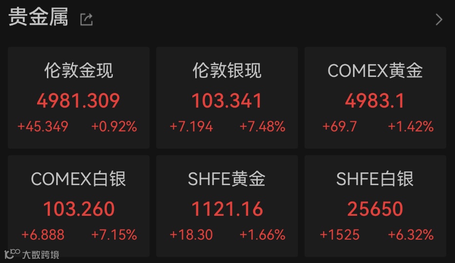 受地缘局势持续升温影响,贵金属上演史诗级大涨。周五(1月23日)纽约交易时段,现货黄金一度涨至4990美元,创历史新高,本周金价累涨超8%;现货白银单日大涨超7%,最高报约103美元/盎司,再创历史新高纪录,本月迄今已暴涨超40%。以期货即月合约收盘价计,金银齐创2020年来最大单周涨幅。