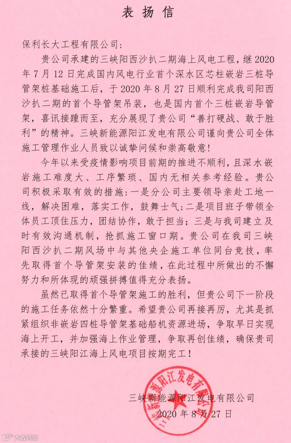 8月27日,保利长大参建的三峡新能源阳西沙扒二期400MW海上风电项目传来喜讯,国内首个“三桩嵌岩式风机基础导管架”吊装成功,与海底桩基精准对位。