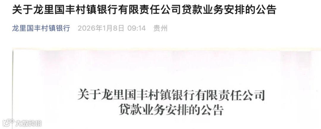 存款方面,自2026年1月9日起,龙里国丰村镇银行全部存款将由贵州银行承接,由贵州银行履行兑付义务,并有序安排了业务交割时间。该行表示,自1月12日起,客户需到对应的贵州银行网点办理业务。