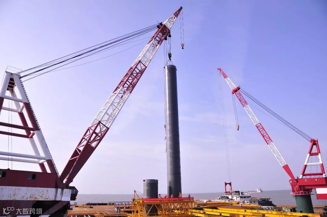 此次下放的钢护筒长35米,内径3.3米,下放重量约70吨,采用200t浮吊整体下放,待钢护筒自沉完成后,由V360振动锤击沉至设计标高。首根桩基钢护筒的顺利下放,也为接下来施工提供了经验借鉴,项目计划于10月中旬完成56根钢护筒下放的施工任务。