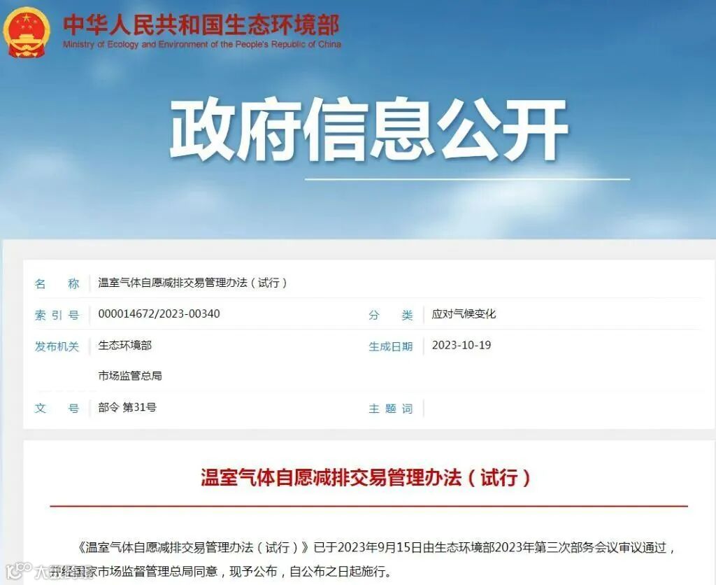 另一值得注意的信号是,《温室气体自愿减排交易管理办法(试行)》由生态环境部和市场监管总局共同发布。