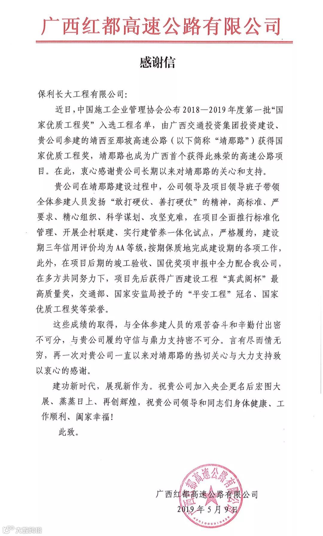 公司收到项目业主发来的感谢信
