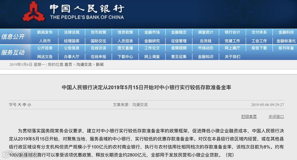 五一节后首个交易日,距离股市开盘前仅30秒左右的时间,央行发布消息称,为贯彻落实国务院常务会议要求,建立对中小银行实行较低存款准备金率的政策框架,促进降低小微企业融资成本,决定从2019年5月15日开始,对聚焦当地、服务县域的中小银行,实行较低的优惠存款准备金率。对仅在本县级行政区域内经营,或在其他县级行政区域设有分支机构但资产规模小于100亿元的农村商业银行,执行与农村信用社相同档次的存款准备金率,该档次目前为8%。约有1000家县域农商行可以享受该项优惠政策,释放长期资金约2800亿元,全部用于发放民营和小微企业贷款。