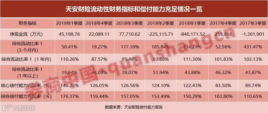 天安财险在报告中称,将加强资产配置管理,提高资产的流动性,全力确保到期债务的及时兑付。在签单保费较去年同期下降80%和固定收益类投资资产损失本息20%的两种压力情景下,流动性覆盖率分别为145.88%和122.86%,公司“优质流动资产的期末账面价值”完全可以覆盖“未来一个季度的净现金流”。根据以上指标监测结果,2019年1季度公司未发生流动性风险。