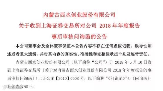 西水股份近日公告称,5月10日收到上海证券交易所《关于对内蒙古西水创业股份有限公司2018年年度报告的事后审核问询函》(下称《问询函》),要求其就五大方面进一步补充披露信息。其中关于保险业务的主要有三点: