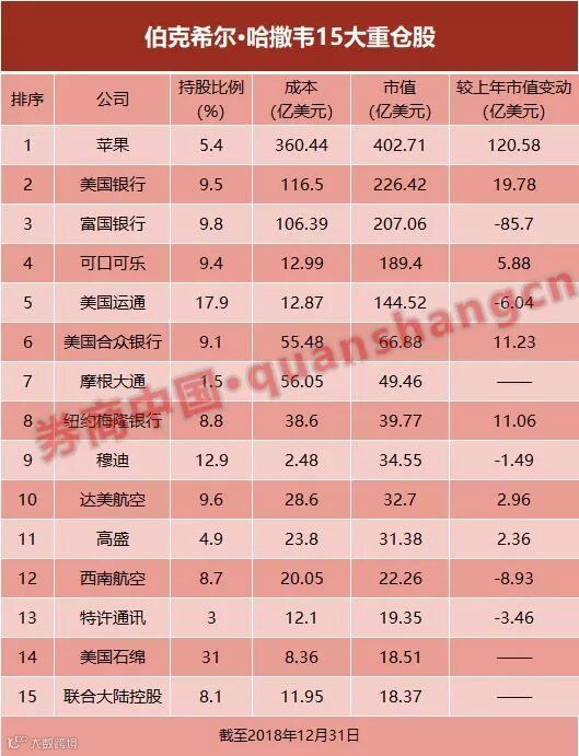 巴菲特照例在“致股东信”中,公布了2018年底伯克希尔哈撒韦的前15大重仓股。
