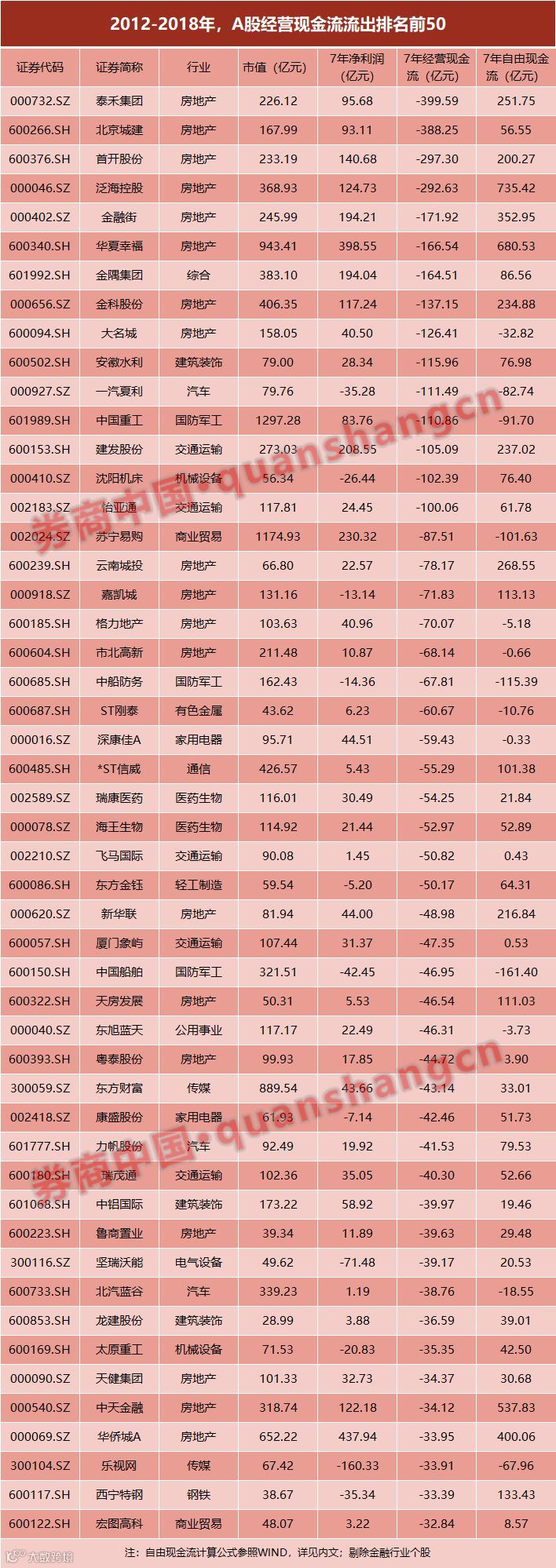据券商中国记者统计,2012-2018年间,有148股经营现金流净流出超10亿元,有55股的经营现金流净流出超30亿元,有28股的经营现金流净流出超50亿元,有15股的经营现金流净流出超100亿元,还有4股的经营现金流净流出超200亿元。