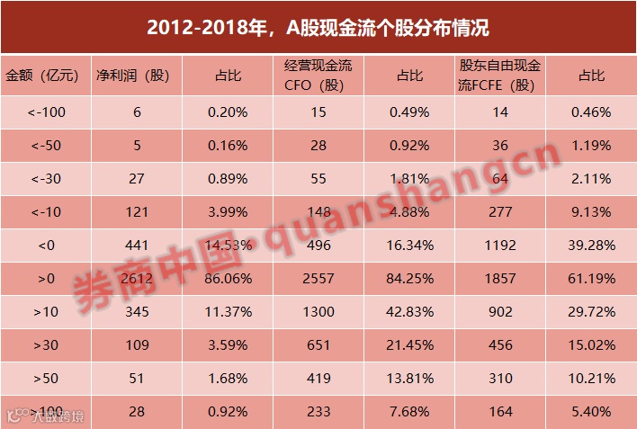 在2018年年报发布后,券商中国记者对2012-2018年的A股现金流状况进行统计,发现有1196股在7年里的自由现金流(FCFE)净流出、占比39.41%,甚至有496股的经营现金流(CFO)也出现净流出、占比16.34%。