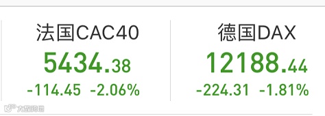 在亚太股市纷纷下挫后,欧洲股市也出现普跌。法国CAC40下跌2.06%,德国DAX下跌1.81%。