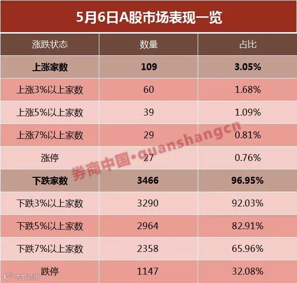 整体来看,A股整体市值从五一节前55.4万亿跌落至今日的51.9万亿,市值一日蒸发3.5万亿。