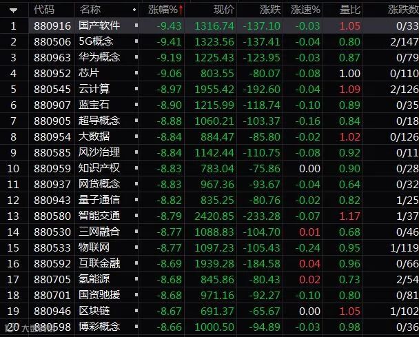 今日,两市各大行业板块全线尽墨,翻红个股仅100余只,国产软件、芯片、5G概念、芯片等科技股成杀跌重灾区,板块跌幅均超过9%,板块个股几乎全线跌停。