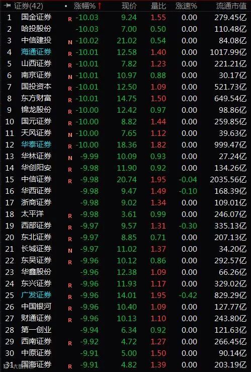 此外,券商板块指数大跌逾9%,国金证券、海通证券、中信建投、山西证券、南京证券等31只股票跌停。