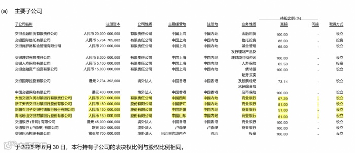 报告期内,该行还控股的村镇银行包括大邑交银兴民村镇银行、新疆石河子交银村镇银行和青岛崂山交银村镇银行,截至2025年6月末的持股比例分别为97.29%、51%、51%。