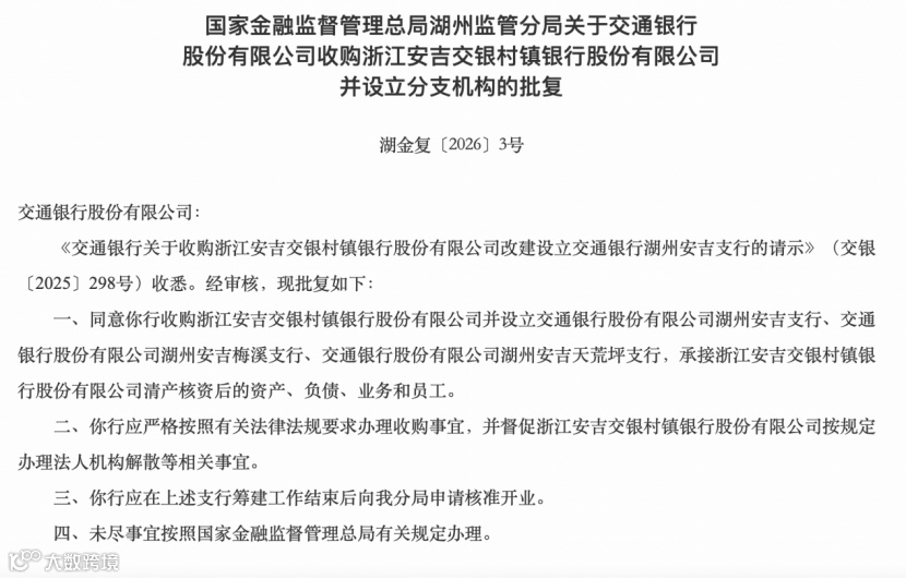 近日,国家金融监督管理总局湖州监管分局作出批复,同意交通银行收购浙江安吉交银村镇银行,并设立交通银行湖州安吉支行、交通银行湖州安吉梅溪支行和交通银行湖州安吉天荒坪支行,承接浙江安吉交银村镇银行清产核资后的资产、负债、业务和员工。