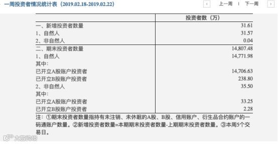 从周数据来看,中国结算官网每周新增投资者数据更新至2019年2月18日至2019年2月22日,当周新增投资者数量是31.61万,相比前一周的新增20.66万,环比大涨53%。这也是自2018年4月份以来,单周新增投资者数量首次超过30万。