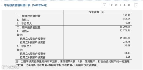 在4月份新增的153.11万投资者中,自然人投资者为152.65万,非自然人投资者数量为0.46万。