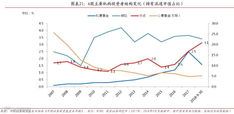 国金证券研究,根据持有股票市值占比刻画投资者结构,可以看到,2004年以来,个人投资者占比不断下降,机构投资者占比提升;在机构投资者内部,外资占比近几年持续提升,特别是2017年深股通开通叠加A股纳入MSCI等国际指数之后。
