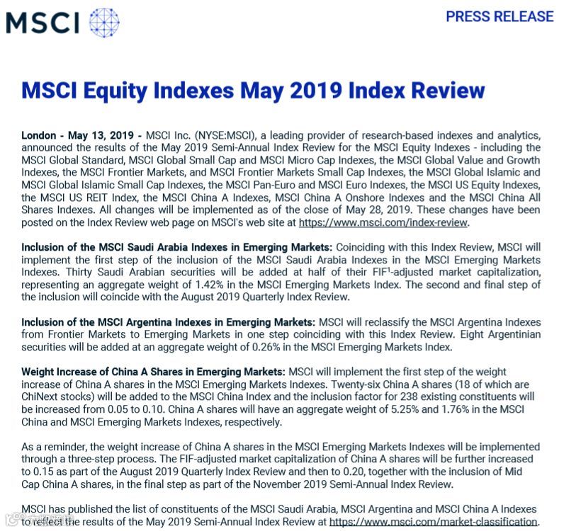 北京时间5月14日早5点,明晟公司(MSCI)公布了2019年5月的半年度指数审议结果,以及A股扩容第一阶段新纳入和剔除的A股个股名单。此番指数审议结果将在5月28日收盘后生效。