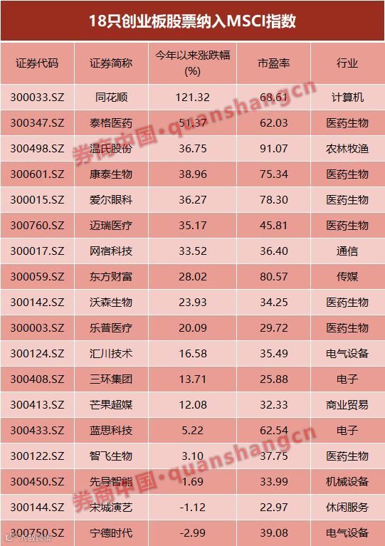 5月14日清晨,明晟公司(MSCI)宣布,将指数里的中国大盘A股纳入因子从5%提高至10%。26只中国A股将被纳入MSCI中国指数,其中18只为创业板成分股:
