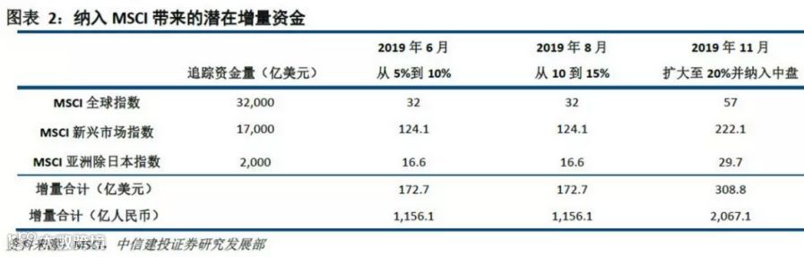 中信建投证券研究发现,按照当前方案,MSCI本次扩大纳入将带来增量资金172.7亿美元(约合人民币1156亿元),8月也会有同量的增量资金流入,在11月将带来增量资金308.8亿美元(约合人民币2067亿元),合计带来增量资金654.2亿美元(约合人民币4379.3亿元)。