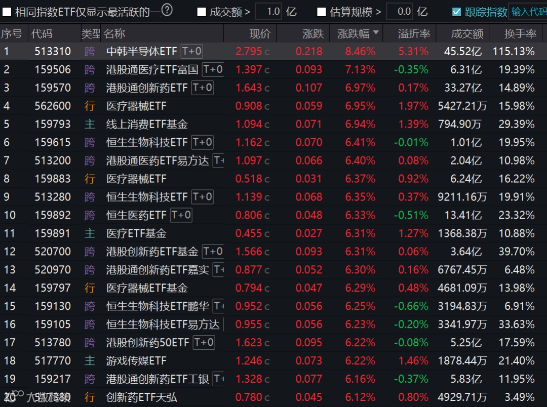 此外,得益于外围等市场上涨跨境ETF同样出现不俗表现,185只跨境ETF上涨,占比同样超过90%。从细分赛道来看,资金追逐的同样是半导体、医药等主题ETF。其中,华泰柏瑞基金旗下的中韩半导体ETF全天上涨8.46%,是当天全市场涨幅最高的ETF。跟踪港股医药类指数的港股通医疗ETF富国、港股通创新药ETF、恒生生物科技ETF、港股通医药ETF易方达等10多只ETF,涨幅均超过6%。