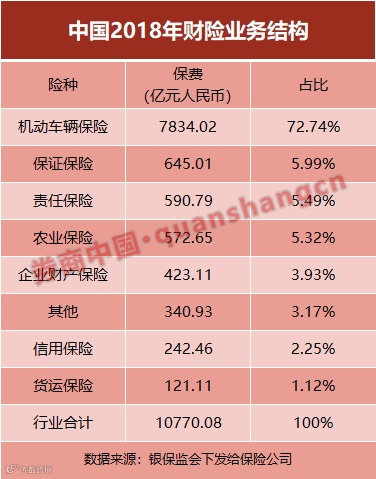 从我国的情况看,据券商中国记者获悉的数据,银保监会统信部通报给行业的数据中,财险业保费收入10770.08亿元人民币,列示的主要业务险种保费中,划分口径为机动车辆保险、保证保险、责任保险、农业保险、企业财产保险、其他、信用保险、货运保险。
