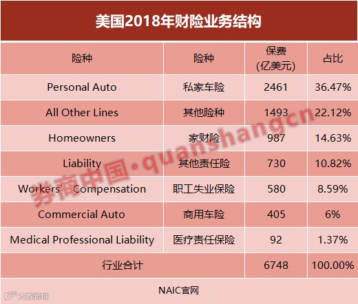 NAIC将美国财产险业务大体分成六大类,分别为私家车险、商用车险、职工失业保险、医疗责任保险、家财险、其他责任险,其余的归入其他类。