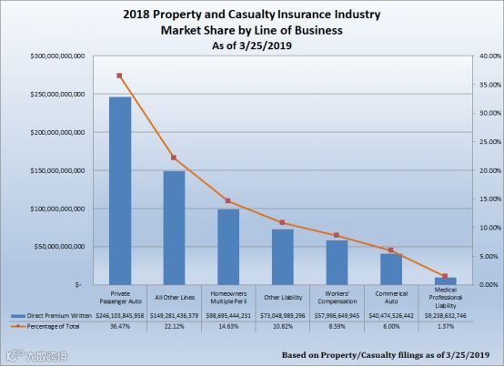 根据美国保险监督官协会(NAIC)近期发布的数据,2018年美国财险市场最大的业务为私家车险业务,不过占比仅略超三分之一;加上商用车险(占比6%),车险合计占比仅42%,不足一半。