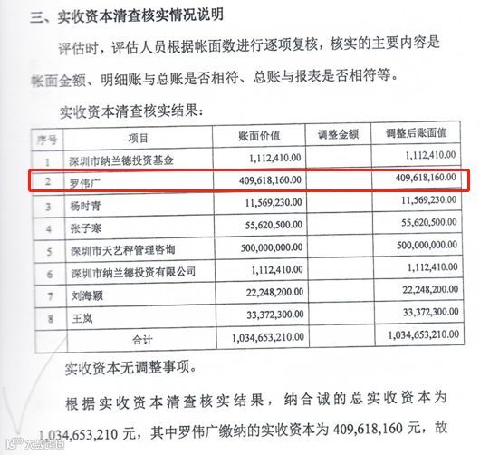 共青城纳合诚实收资本10.35亿元,单一大股东为深圳市天艺秤管理咨询公司出资5亿元,该公司为建银国际(深圳)投资有限公司旗下,罗伟广出资4.09亿元,持股比例为39.59%。
