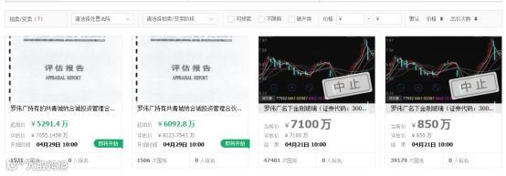 平台显示,罗伟广持有共青城纳合诚39.59%的股权,分为两笔拍卖,分别为9.59%股权和11.05%股权,将于4月29日上午10时至4月30日10时在网上拍卖。截至发稿,目前两笔股权拍卖已经吸引网上1521次和1506次围观。