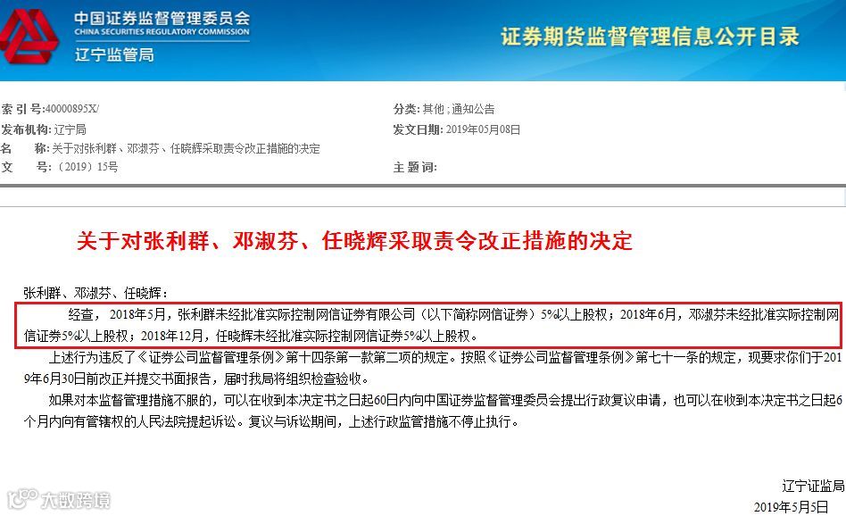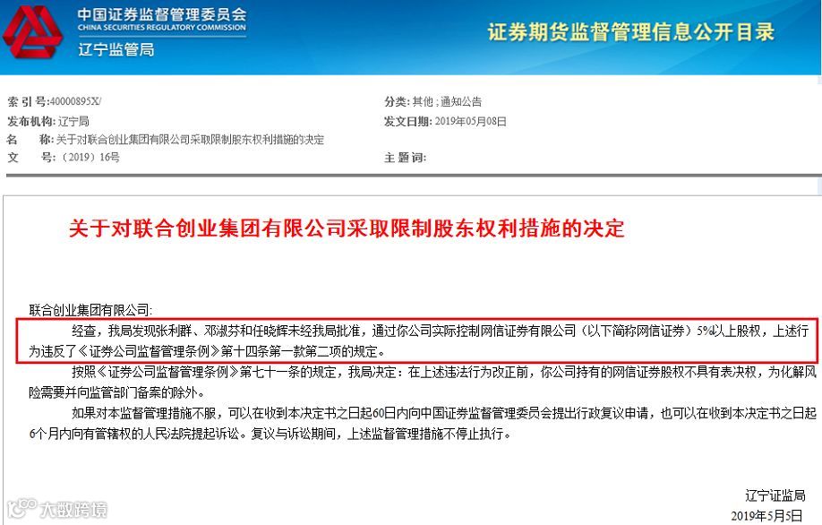 辽宁证监局称,张利群、邓淑芬和任晓辉未经批准,通过联合创业集团实际控制网信证券5%以上股权。基于此,在上述违法行为改正前,联合创业集团持有的网信证券股权不具有表决权,为化解风险需要并向监管部门备案的除外。