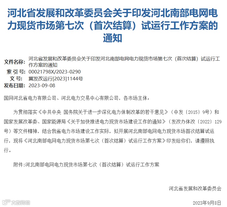 9月8日,河北省发改委印发了河北南部电网电力现货市场第七次(首次结算)试运行工作方案的通知,拟开展河北南部电网电力现货市场首次结算试运行。