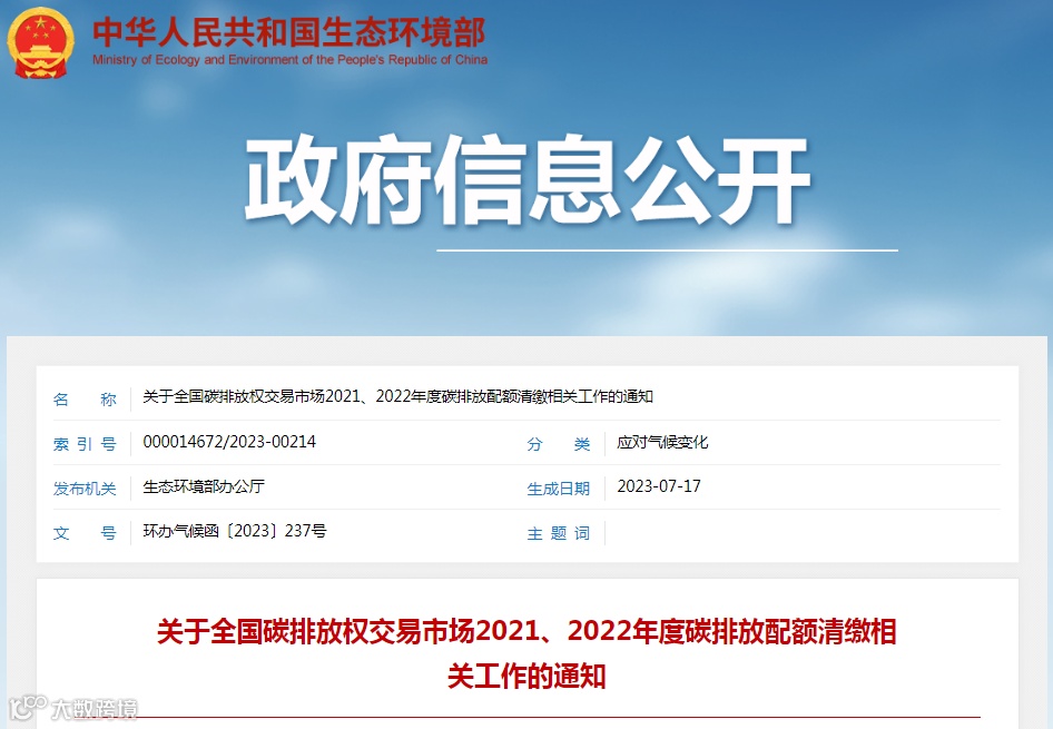 7月17日,生态环境部发布《关于全国碳排放权交易市场2021、2022年度碳排放配额清缴相关工作的通知》(以下简称《通知》)。