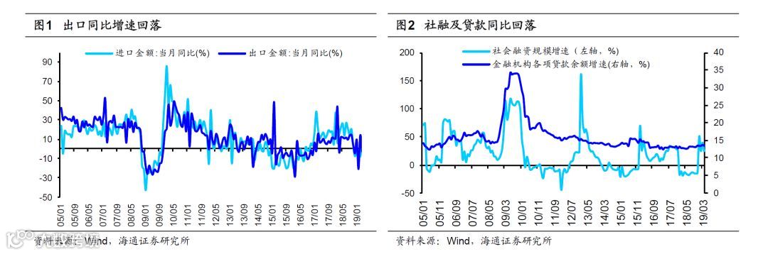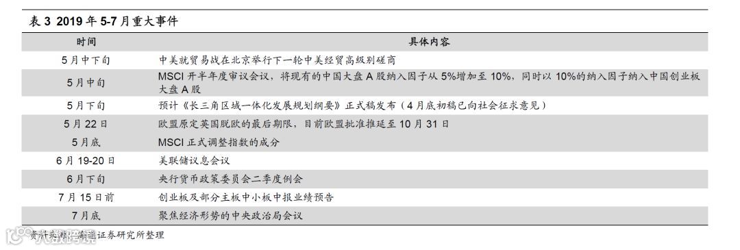 我们节前报告《小心溜车-20190421》中就指出市场上涨好比开车爬坡,开到一定高度之后,只有继续加油门车才能向上爬,如果油门没加够,则有溜车风险。进一步梳理基本面数据,发现基本面领先指标大多企稳,同步指标大多仍较弱,基本面难以接力,市场回撤休整格局已确立。根据海关总署统计,4月我国以美元计价出口同比回落至-2.7%(前值14.2%),较1-3月出口的累计同比(1.4%)小幅下滑,表明出口仍偏弱。央行公布4月金融统计数据,4月新增社融1.36万亿元,社融存量同比增速10.4%,低于前值10.7%;M1和M2增速分别回落至2.9%和8.5%(前值4.6%、8.6%);金融机构贷款增加1.02万亿元,较上月减少0.67万亿元。高频数据看5月前7天38城地产销量增速由正转负至-27%,4月增速-5.3%,且一二线销量增速明显下滑。之前公布的4月PMI为50.1%,比上月回落0.4个百分点,从历史数据看,2005-2018年这14年中4月的PMI平均值为53.7%,高于3月的53.3%,而今年4月PMI环比低于3月,可见4月经济数据较弱。